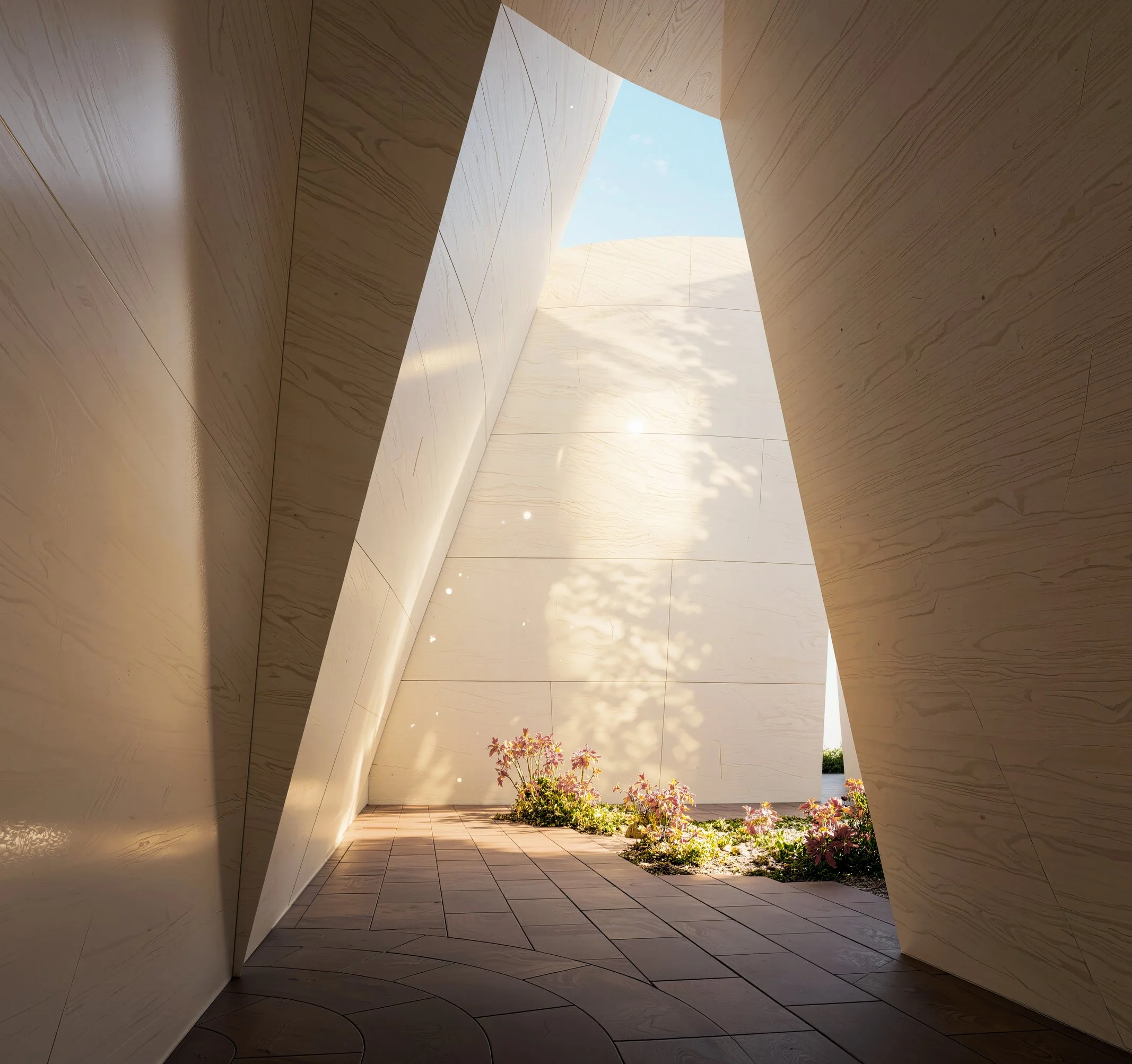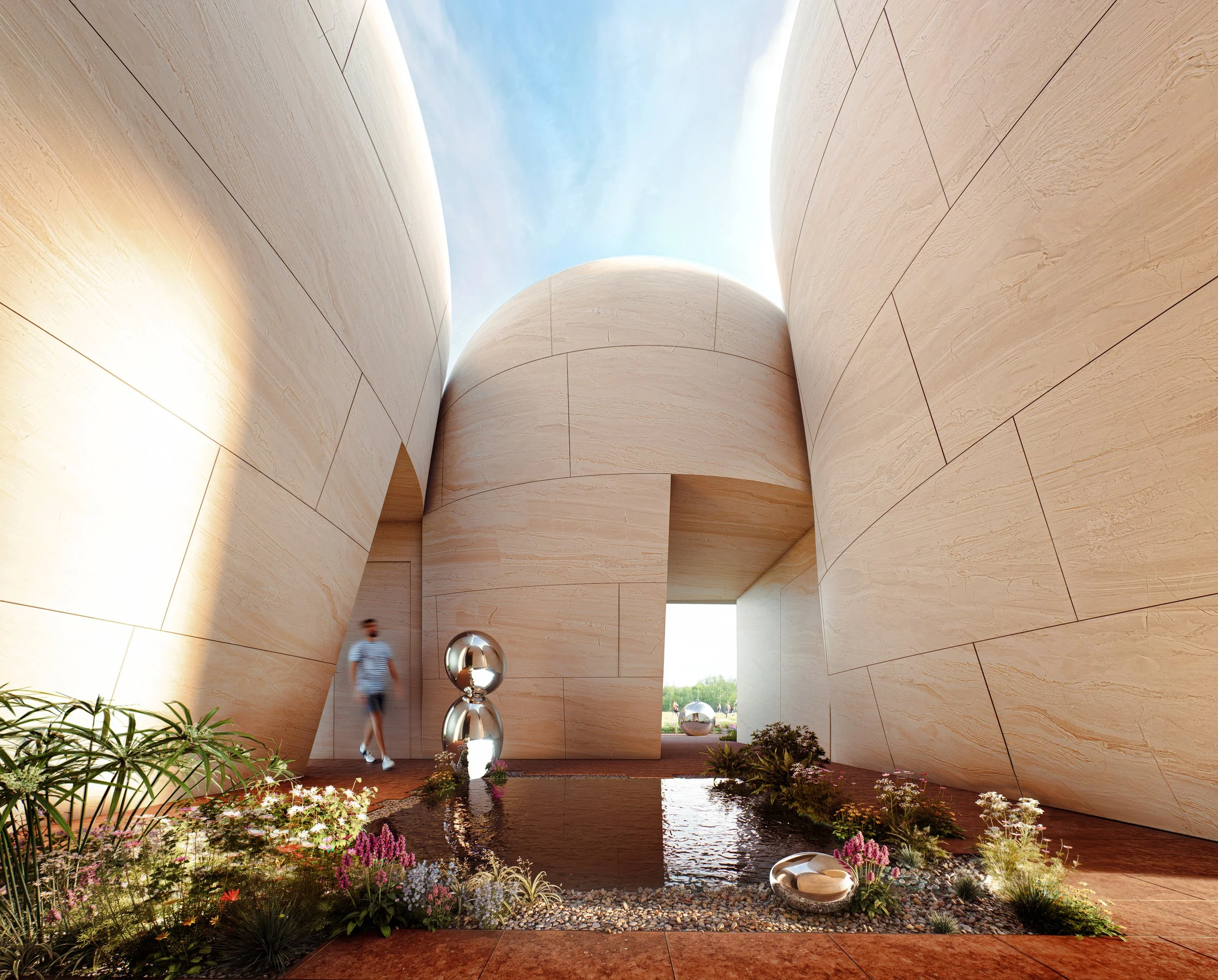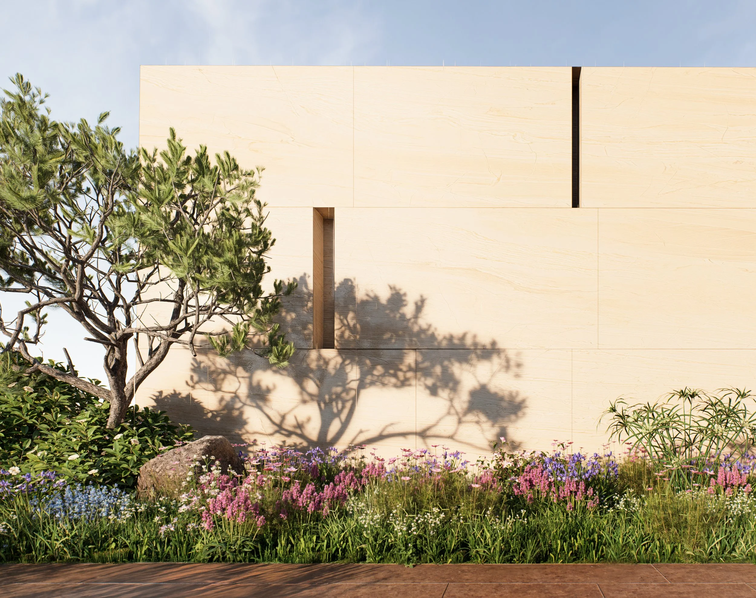 The pavilion references the arches of the façade, drawing visitors into the gallery space. The landscape is shaped by the traditional masonry façade, where the edge and pattern of the planting are defined and pixelated by the layout of the bricks. The community garden will feature seasonal herbs and various local vegetation, serving both as a public space and an educational field for biodiversity.