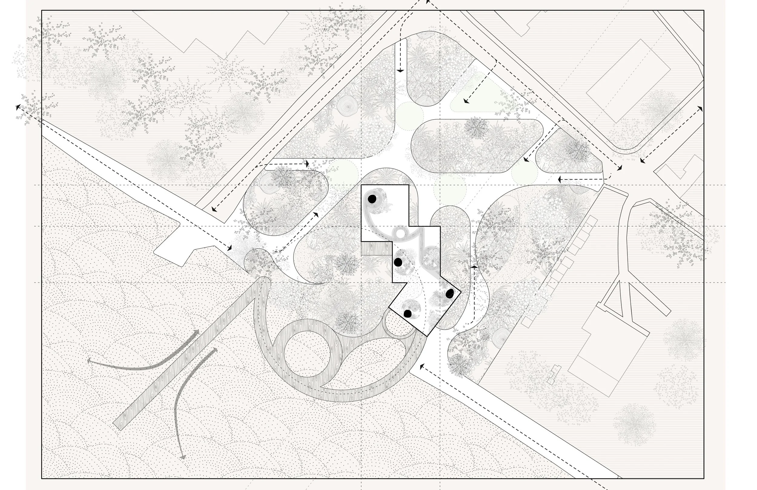 Located in the Daljan neighborhood, the original Youth Union Summer Retreat (YUSR) building, once home to the nautical club, has been a local charm for decades. With its rich history connecting Lake Ohrid and the community, the proposed new nautical club will bridge the past with the present, and the vernacular identity with cultural exchange. The redesigned landscape will extend from the original YUSR, seamlessly linking the residential street grid to the waterfront. Northern entrance paths will reflect the 1940s urban grid, creating a welcoming arrival. South-facing walkways will guide visitors toward the promenade, integrating the new club with the surrounding park. This revitalized landscape transforms the flat waterfront into a lush garden, preserving existing trees and fostering spaces for social and environmental interaction.